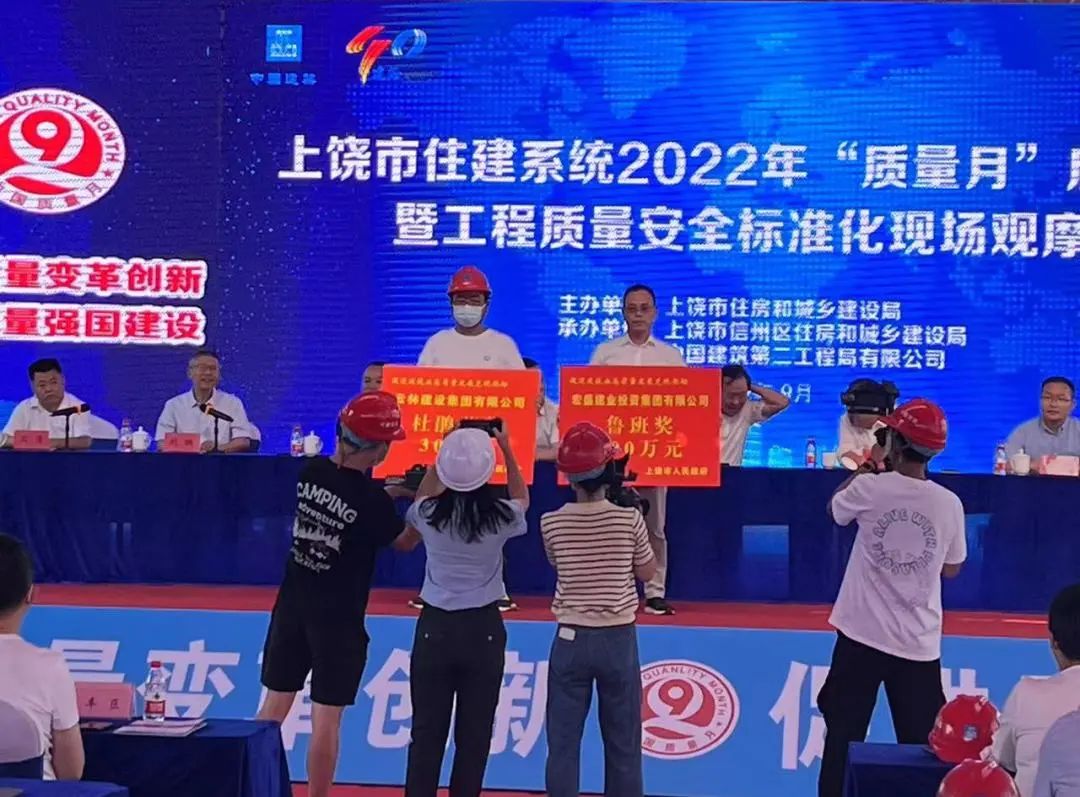 活動現(xiàn)場,副市長李茂榮與市住建局局長陳鋒為2021年度獲得“魯班獎”和“杜鵑花獎”的企業(yè)頒獎,宏盛建業(yè)集團榮獲上饒市首個“魯班獎”并獲得扶持獎金200萬元。