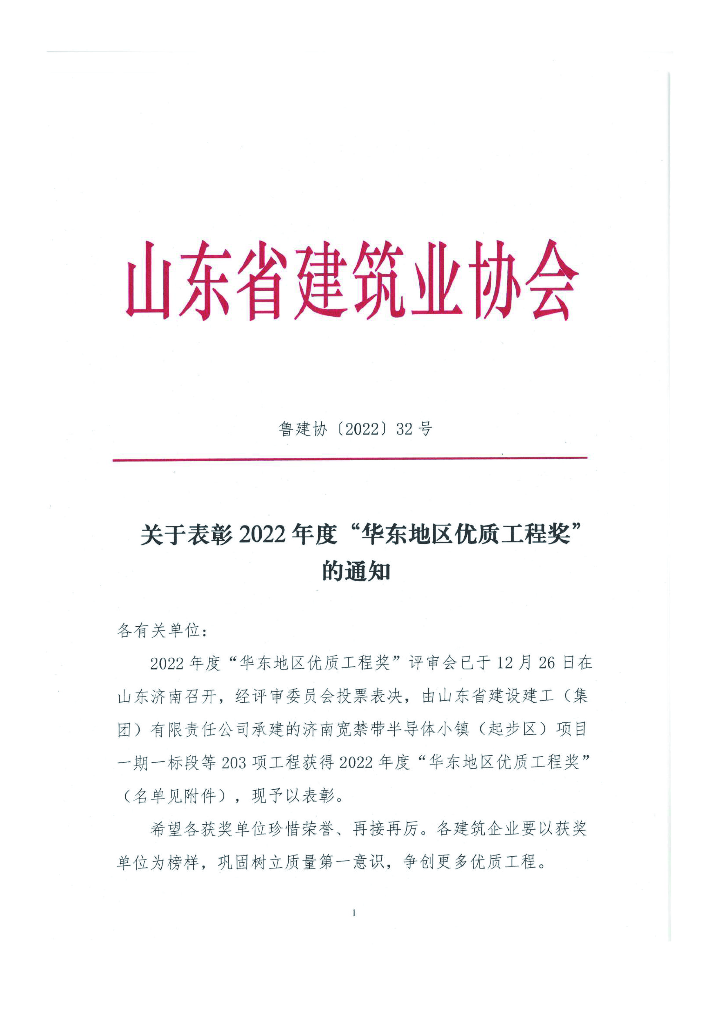 近日,山東省建筑業(yè)協(xié)會魯建協(xié)(2022)32號文件中公布了關(guān)于表彰2022年度“華東地區(qū)優(yōu)質(zhì)工程獎(jiǎng)”的通知。宏盛建業(yè)投資集團(tuán)承建的“上饒裝配式建筑產(chǎn)業(yè)示范基地(朝陽園)設(shè)計(jì)施工總承包項(xiàng)目”獲評2022年度“華東地區(qū)優(yōu)質(zhì)工程獎(jiǎng)”榮譽(yù)稱號。
