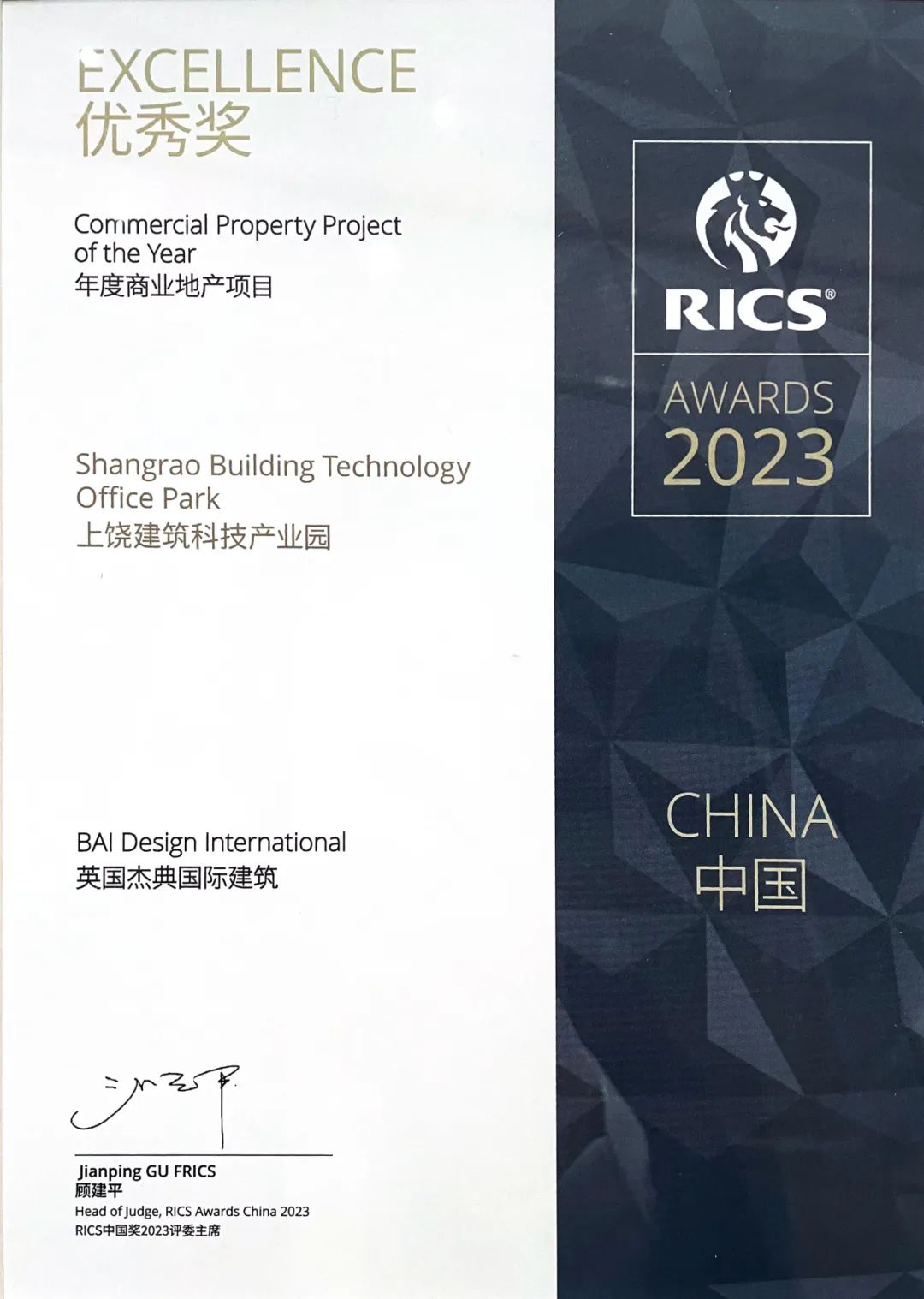 這一年,上饒建筑科技產(chǎn)業(yè)園榮獲2023年RICS(英國皇家特許測量師學(xué)會)年度商業(yè)地產(chǎn)項(xiàng)目優(yōu)秀獎,這也是英國建筑建造業(yè)內(nèi)的最高獎項(xiàng)。