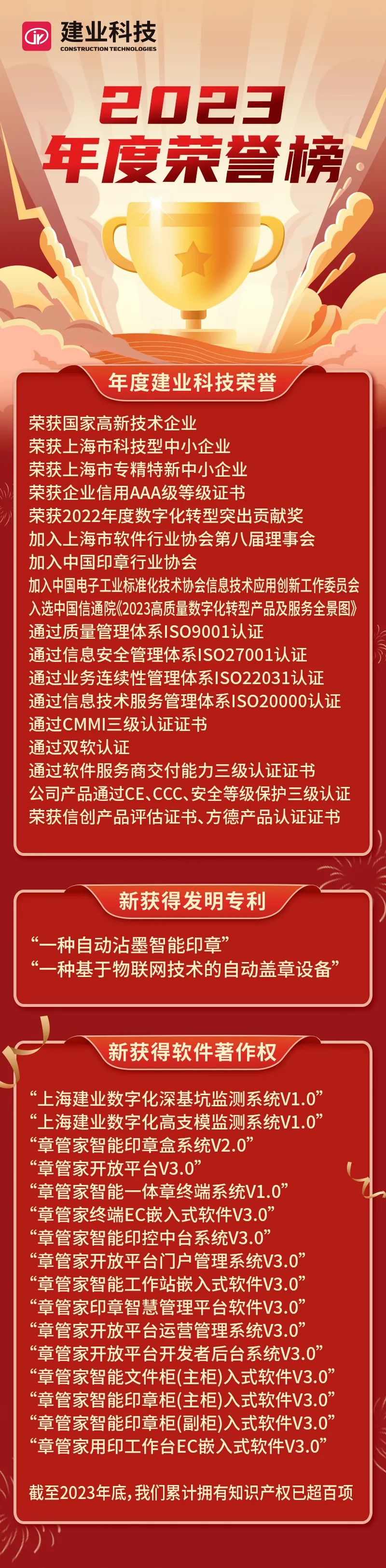 這一年,集團(tuán)旗下上海建業(yè)信息科技股份有限公司成功增獲2項(xiàng)由國家知識產(chǎn)權(quán)局頒發(fā)的發(fā)明專利證書,新增中華人民共和國國家版權(quán)局授權(quán)的16項(xiàng)軟件著作權(quán)。截至2023年底累計(jì)擁有知識產(chǎn)權(quán)已超百項(xiàng)。