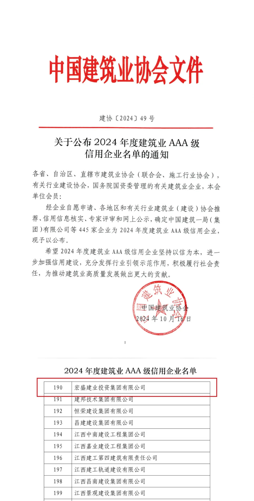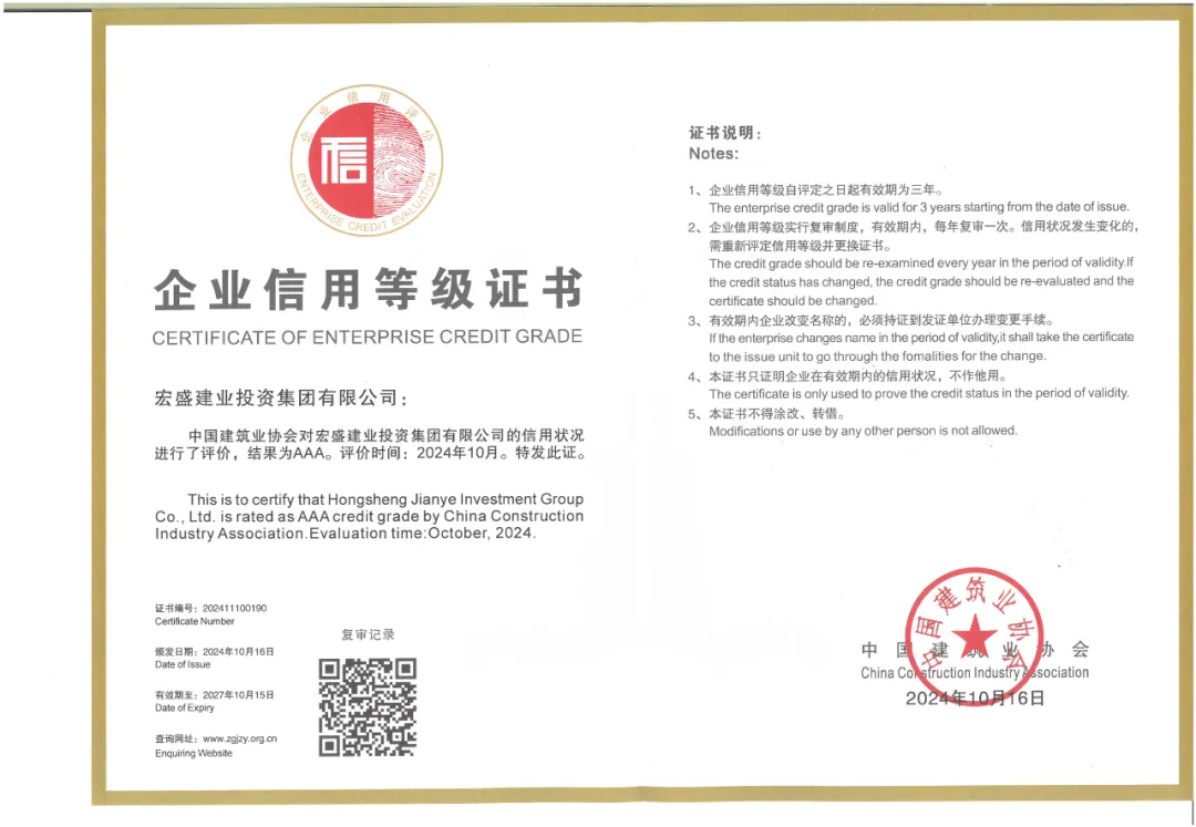 導(dǎo)讀:近日,中國建筑業(yè)協(xié)會(huì)發(fā)布了《關(guān)于公布2024年度建筑業(yè)AAA級信用企業(yè)名單的通知》。宏盛建業(yè)投資集團(tuán)有限公司榜上有名,這是自2016年首次獲評后,公司連續(xù)3次獲評該稱號。