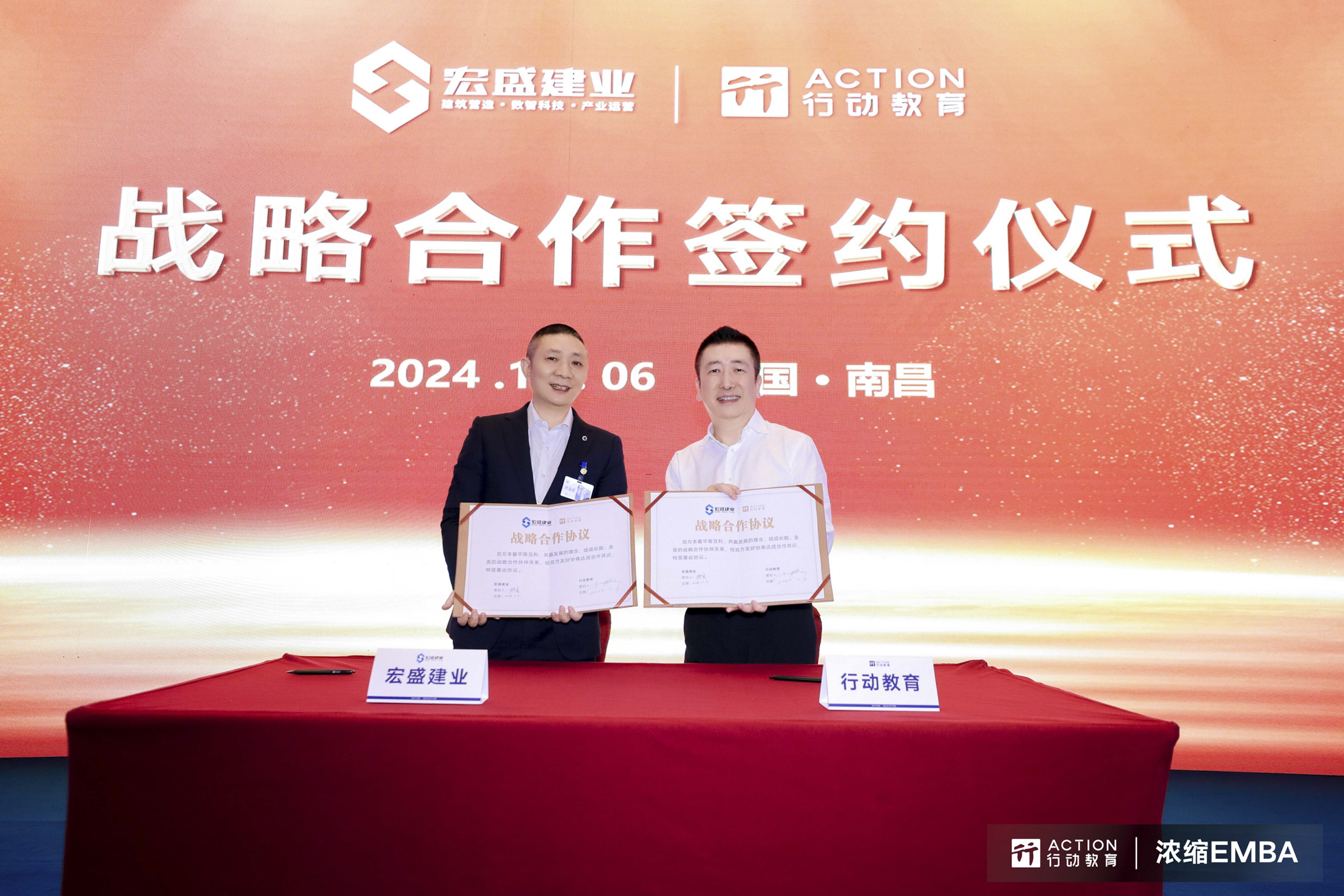 2024年11月6日,宏盛建業(yè)投資集團(tuán)有限公司與上海行動(dòng)教育科技股份有限公司在江西南昌隆重舉行了戰(zhàn)略合作簽約儀式,共同開啟了企業(yè)發(fā)展新篇章。作為國內(nèi)民營建筑企業(yè)和企業(yè)教育培訓(xùn)領(lǐng)域的佼佼者,此次合作是兩大行業(yè)領(lǐng)先者基于共同價(jià)值觀和發(fā)展愿景的深度融合,標(biāo)志著雙方邁向共贏發(fā)展的新階段。