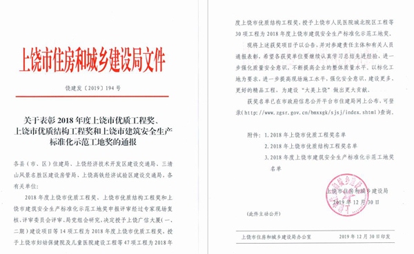 據(jù)了解,本次共通報(bào)表彰了2018年度上饒市優(yōu)質(zhì)工程獎(jiǎng)14項(xiàng),2018年度上饒市優(yōu)質(zhì)結(jié)構(gòu)工程獎(jiǎng)47項(xiàng),2018年度上饒市建筑安全生產(chǎn)標(biāo)準(zhǔn)化示范工地獎(jiǎng)30項(xiàng)。