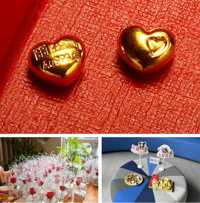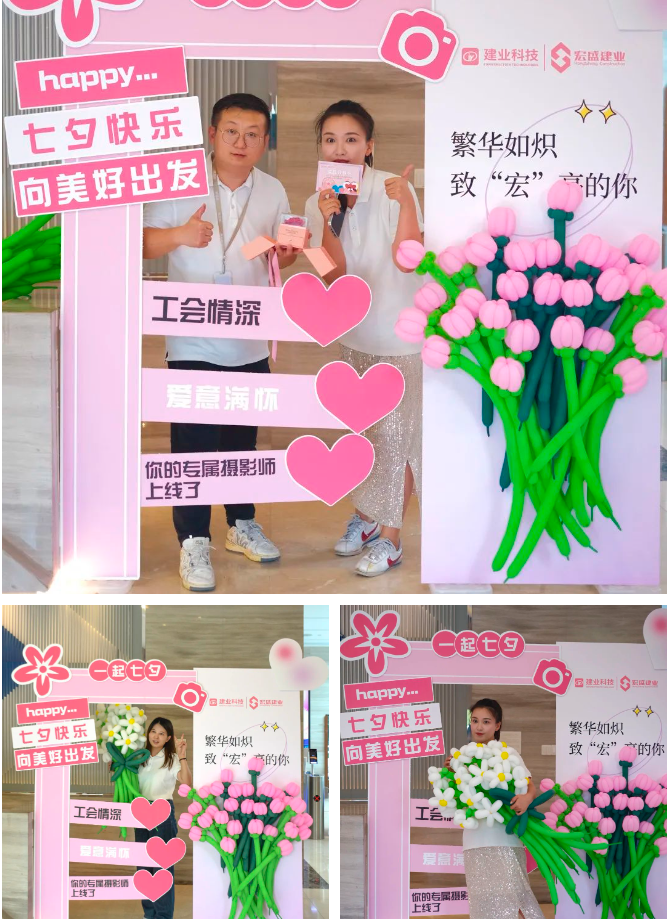 集團一樓大廳內(nèi)設(shè)立了七夕節(jié)日打卡點,精心布置的背景墻搭配一束小雛菊,為前來打卡的員工提供了一個浪漫的拍照機會。伴隨著歡快的音樂,員工們在這里留下了屬于他們的美好瞬間,將愛意通過鏡頭傳遞,點亮了整個大廳。