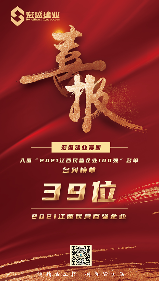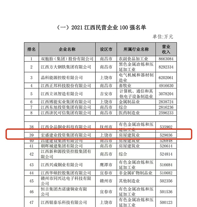 宏盛建業(yè)榮膺“2021江西民營企業(yè)100強”企業(yè)