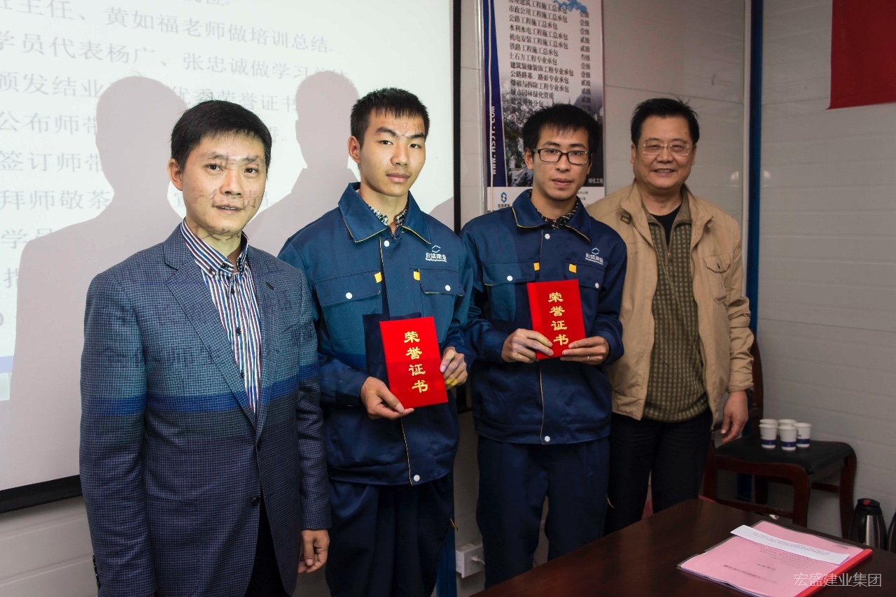 集團(tuán)公司2015年秋季招聘首期“新動(dòng)力、新未來(lái)、新發(fā)展”的新員工培訓(xùn),歷經(jīng)10天并經(jīng)嚴(yán)格的考試與考核,14位宏盛新員工順利結(jié)業(yè)。10月24日集團(tuán)公司在南江項(xiàng)目部舉辦了新員工結(jié)業(yè)暨拜師儀式,集團(tuán)公司副總裁周金旺及項(xiàng)目部各單位負(fù)責(zé)人出席本次活動(dòng)。新員工在各位導(dǎo)師的祝福與寄托中紛紛拿到了結(jié)業(yè)證書。