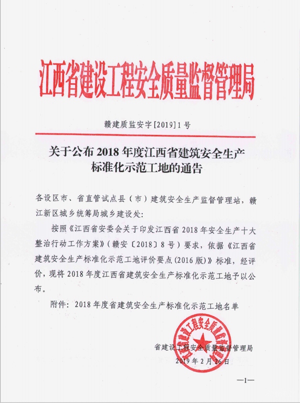 據(jù)悉,本次獲評(píng)“2018年度江西省建筑安全生產(chǎn)標(biāo)準(zhǔn)化示范工地”的項(xiàng)目共有142個(gè)。名單是由江西省建設(shè)工程安全質(zhì)量監(jiān)督管理局,按照江西省安委會(huì)關(guān)于印發(fā)江西省2018年安全生產(chǎn)十大整治行動(dòng)工作方案(贛安[2018]8號(hào))要求,依據(jù)江西省建筑安全生產(chǎn)標(biāo)準(zhǔn)化示范工地評(píng)價(jià)要點(diǎn)(2016版)標(biāo)準(zhǔn),嚴(yán)審評(píng)定出來(lái)的。