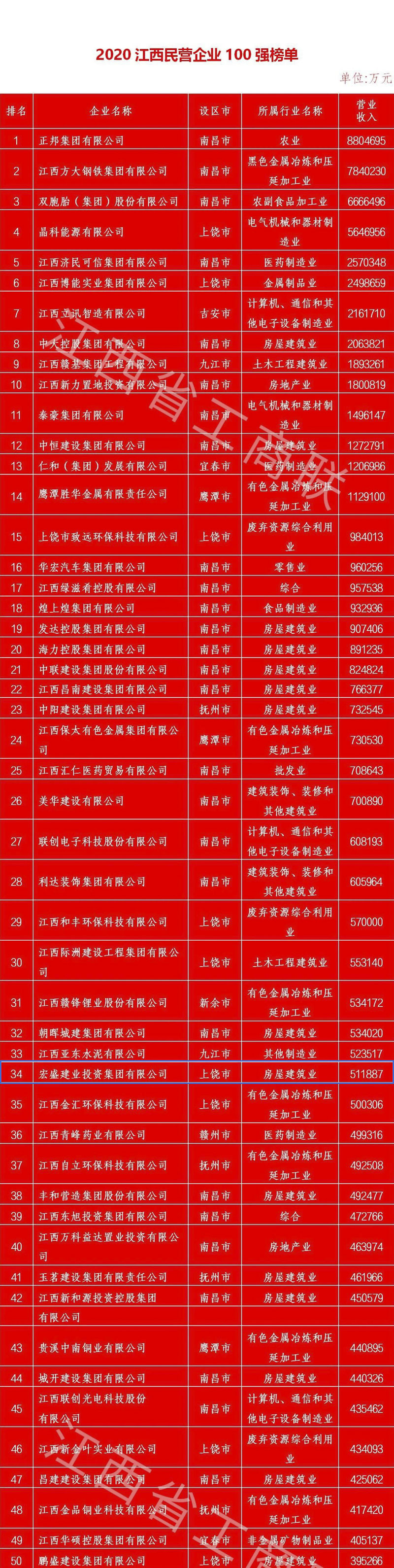 祝賀丨江西百?gòu)?qiáng)民企新鮮出爐 宏盛建業(yè)榮登第 34 位