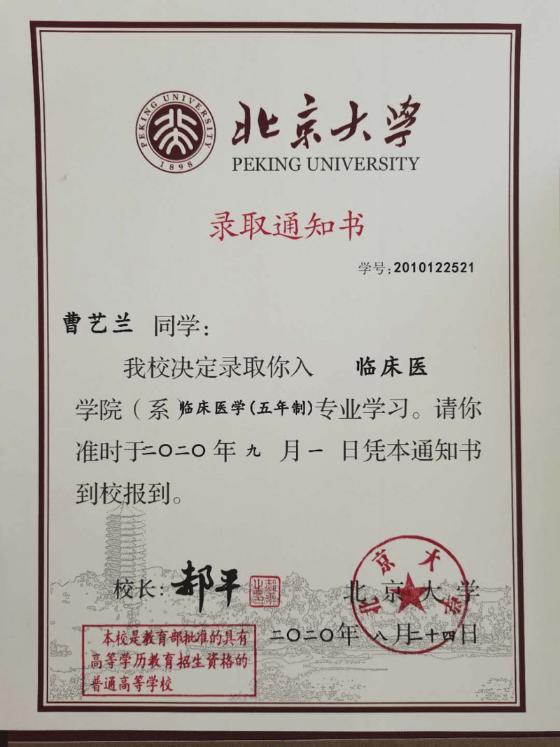 曹藝蘭,祖籍宜賓觀音鎮(zhèn),2020年以688分的優(yōu)異成績被北京大學(xué)臨床醫(yī)學(xué)專業(yè)錄取。三溪雅苑喜聞?wù)J購業(yè)主子女金榜題名,主動(dòng)對其進(jìn)行定向助學(xué),組織升學(xué)答謝宴。觀音鎮(zhèn)地處宜賓、自貢、內(nèi)江三市交界處山水綺麗、人才輩出,有程氏公許、公說、公碩的南宋一門三進(jìn)士,近代鄭佑之等先賢烈士。近年來,觀音鎮(zhèn)有多名學(xué)子考入清華、北大、人大、南開等國內(nèi)高等學(xué)府。