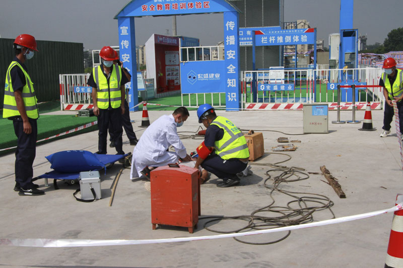 會(huì)后,全體與會(huì)人員觀摩了由贛州文化藝術(shù)中心項(xiàng)目部組織的“建筑施工觸電應(yīng)急演練”。此次演練,主要展現(xiàn)施工現(xiàn)場(chǎng)因不規(guī)范作業(yè)觸電引發(fā)安全事故后的應(yīng)急處置情況。